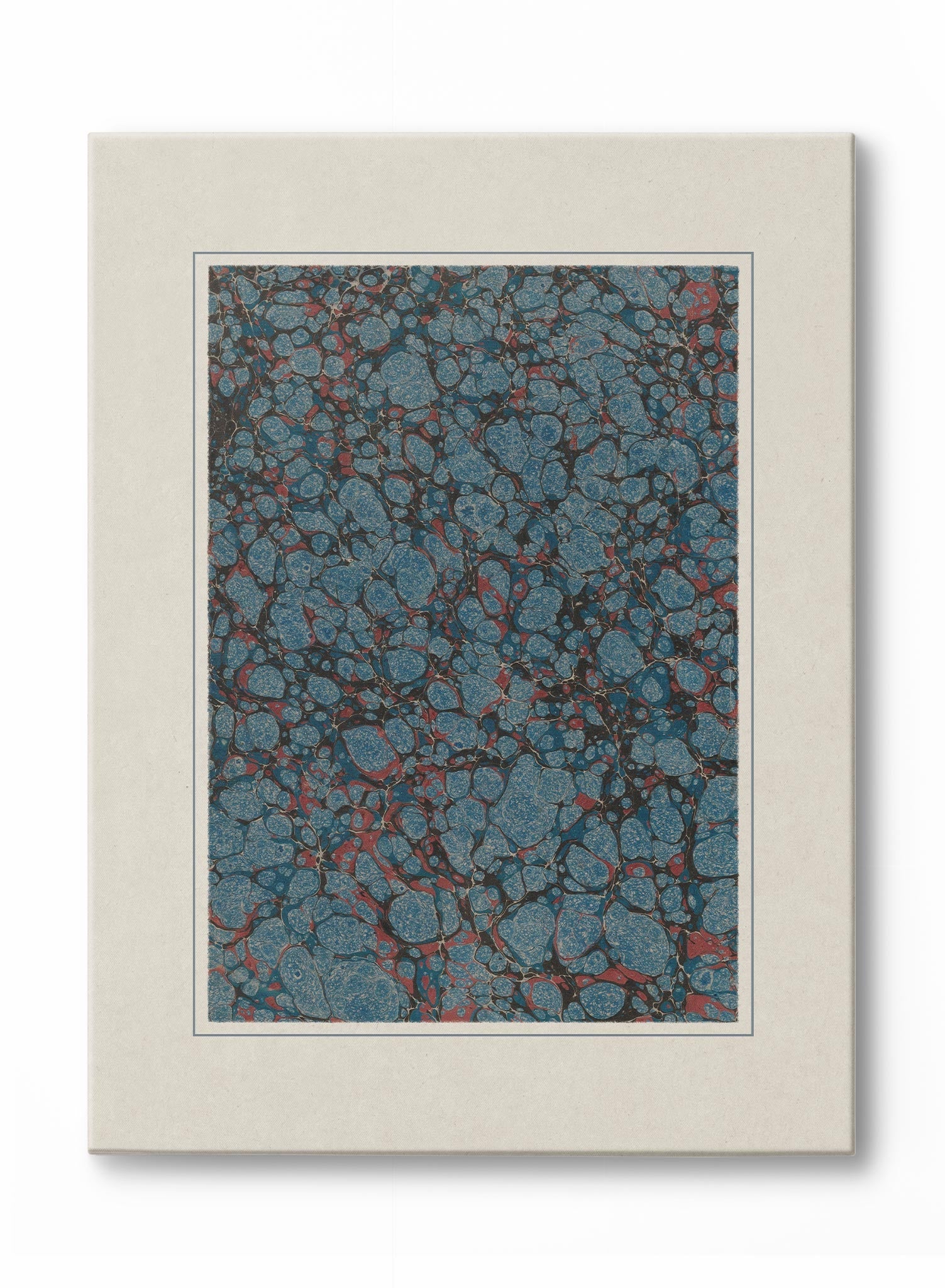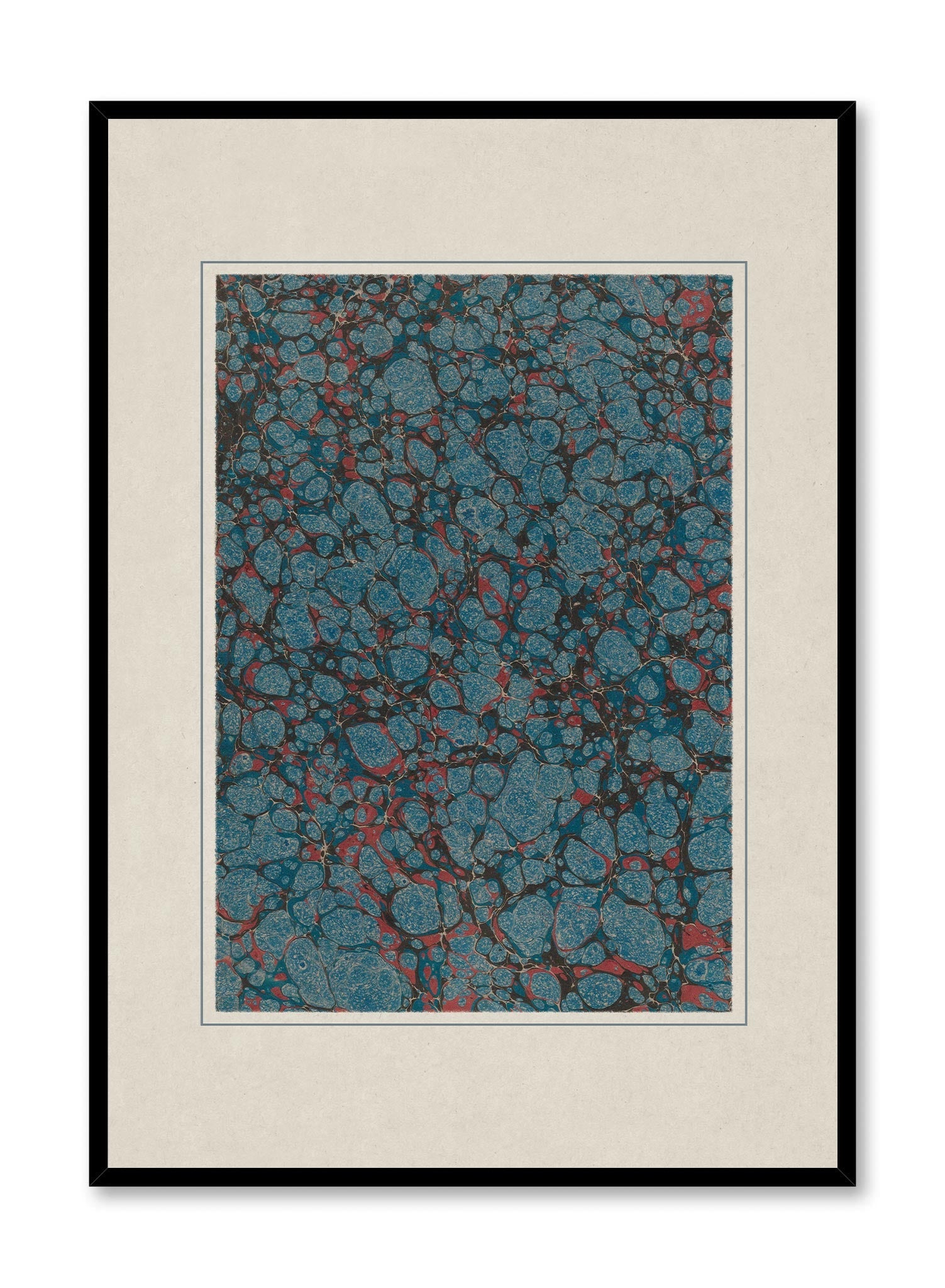 This richly detailed marbled artwork mimics the pattern of riverbed stones, with vivid cerulean and crimson tones delicately laced through a field of charcoal and steel gray. The print captures a sense of fluidity, as if the viewer is gazing into a vibrant, rippling stream.