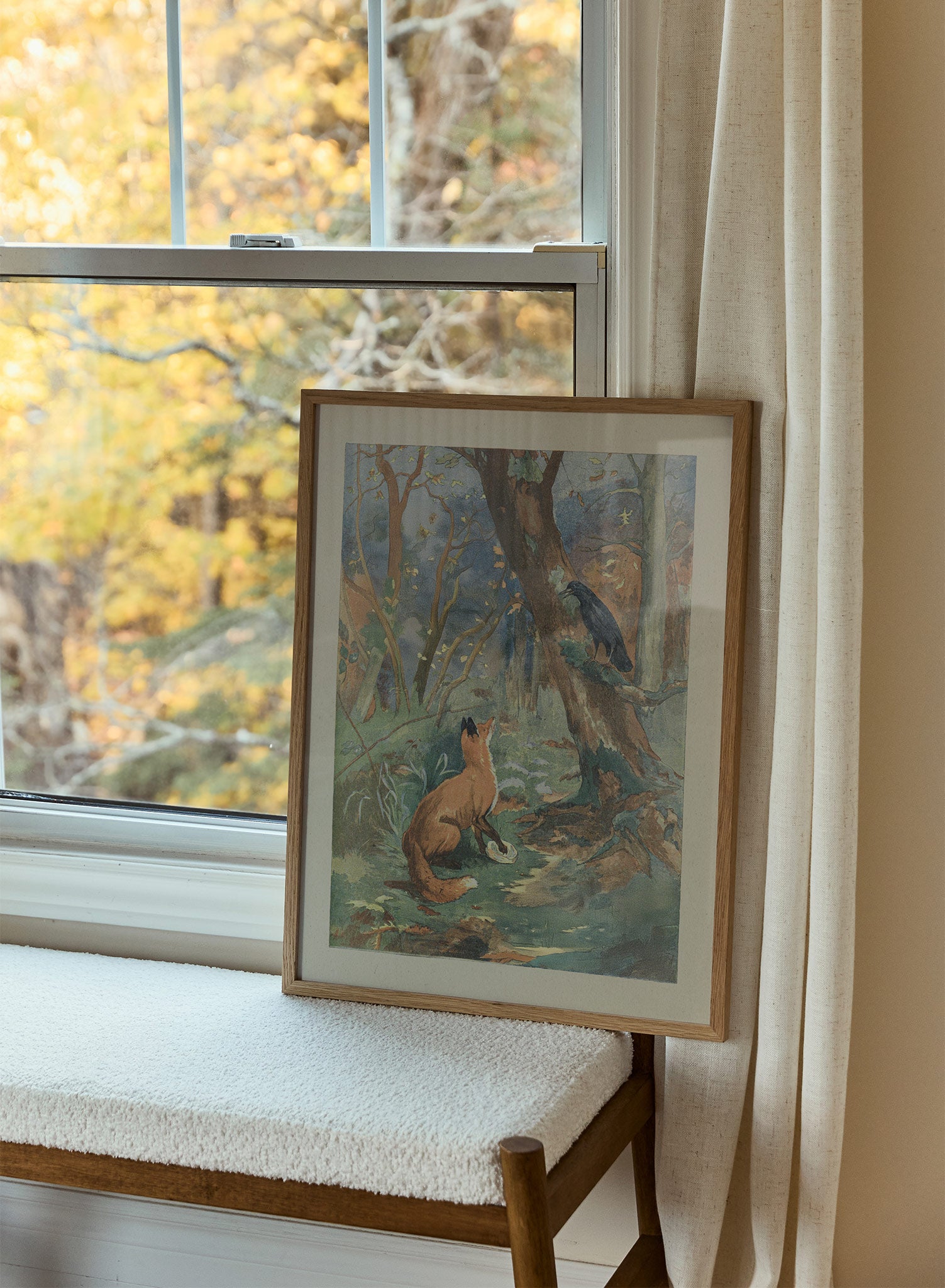 A fox gazes upwards, captivated by a crow perched high in a tree, their interaction brought to life through warm, earthy tones and intricate detailing. The woodland setting brims with subtle textures, from rustling leaves to dappled sunlight filtering through the branches.